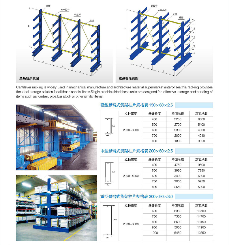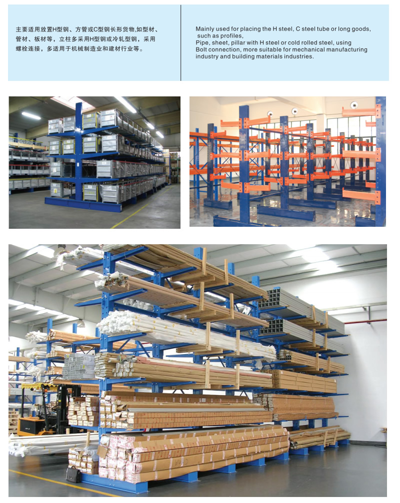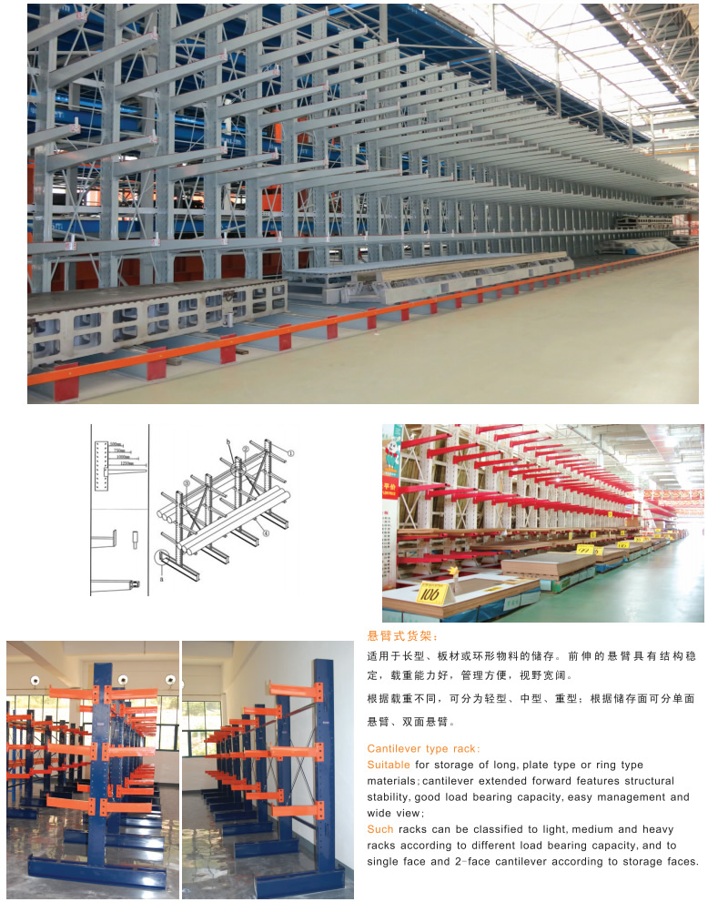 8、懸臂貨(huò)架並不是一(yī)個獨立的個體使用的貨架(jià),可以由多個立柱連(lián)接來組成一列貨(huò)架使用,這樣子(zǐ)每(měi)個貨架單元就可以(yǐ)分類儲存不同類別的貨物,高效存儲木料、管材、長條物等類似產品。立柱上麵帶有由3-4個懸臂和縱(zòng)梁相連組成可調試鉗(qián)位夾(jiá)。