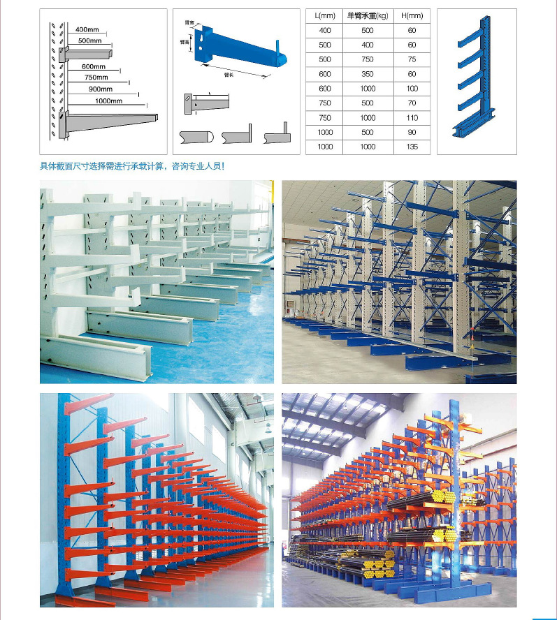 懸臂是屬於倉儲貨架類別中的一類,采用專用型(xíng)材立柱,配高強度懸臂,適用於存放各種長形物料、環型物料、板材和不(bú)規(guī)則物料等。其前伸的懸臂可以是單麵或雙麵,具有(yǒu)結構輕、載重(chóng)能力好的特點,單臂承重可達1000kg.特別加(jiā)固的立柱結構,可以(yǐ)承受(shòu)2000~3000kg壓(yā)力。設計(jì)背拉增加貨架整(zhěng)體穩定性,安裝簡易,配件齊全。組合式結構,專用型材(cái)立柱(zhù),設(shè)計背(bèi)拉增加穩定性,配高(gāo)強度懸臂(臂可以為單麵或雙麵),具結構輕巧、載重能力好(hǎo)、空間利用率高;加了擱板後,特別適合(hé)空間小,高度低的庫房,管理方便,視(shì)野寬闊,與普通擱板式貨架相比,利用率更高;根據承載能力可分為輕量型、中量型、重量型三(sān)種。1、采用方管製作:懸臂式貨架根據相應的懸臂層載要求,先選定(dìng)符合層載要求的方管,切割成需要尺寸,在一頭焊接防滑護板,另一頭焊接連接U型立(lì)柱連接件製作而成。2、采用C型鋼製作:懸臂(bì)式(shì)貨架根據相應的(de)懸臂層載(zǎi)要求,先選定C型鋼的規格,選好後將兩片(piàn)C型鋼對焊,焊接好後在一頭焊接防滑護板,另一頭焊接連接U型立柱連接件。懸臂貨架(jià)柱片與柱片之間(jiān)采用連接(jiē)杆連接,連接杆一般采用矩形管製作(zuò)。為增加安(ān)全和(hé)穩定性,在連接杆上加扁(biǎn)鐵背拉要專用拉子可將柱片緊緊固定。3、所有懸臂貨架部件在生產完成後均為半成品,將(jiāng)經最後一道工序噴塑(sù)。在噴塑前先進行拋丸機拋丸除油、除鏽,再進行噴塑。完成(chéng)後包裝(zhuāng)發貨。