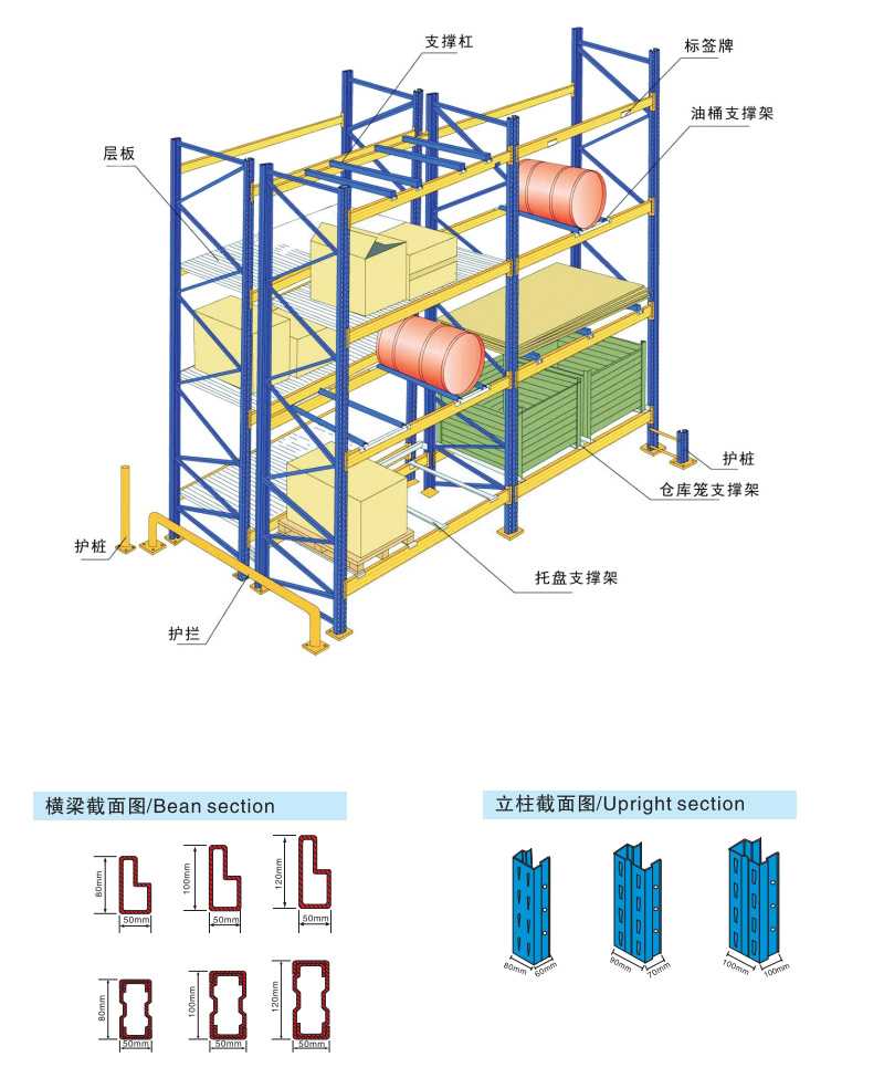 重型橫梁式貨架是目(mù)前使用應用廣泛的貨架類型之一,具有較強的通用(yòng)性,可適應(yīng)各種類型的貨(huò)物,可按貨物尺寸要求調解橫梁高(gāo)度。重型橫梁式貨架主要由立柱、橫梁、橫撐、斜(xié)撐以及自鎖螺栓組裝而成。橫梁與立柱的連接多采用(yòng)機械式的鎖扣結構,可隨意拆裝組合。橫梁采用特(tè)製的冷軋P型(xíng)閉口梁;該結構具有簡單可靠、重量輕、承載力強、造價低(dī)的特點;柱(zhù)卡與立柱連接時配有特(tè)殊設計(jì)安全銷,可以確保橫梁在外力撞擊下不(bú)會(huì)脫(tuō)落。可根據存儲單元集裝設(shè)備的特性加(jiā)裝如:隔檔、鋼層板(木層板)、金屬絲網層、倉儲籠導軌、油桶(tǒng)架等(děng)功能(néng)性附件(jiàn)。根據用戶實際(jì)使(shǐ)用情(qíng)況:托盤載(zǎi)重要求、托(tuō)盤(pán)尺寸、倉庫實際空間、叉車實際提升高度,可提供不同規格的橫梁(liáng)式(shì)重型貨架(jià)以(yǐ)供客戶選擇。 重型橫梁式貨架一般采用冷軋異型鋼製作,立(lì)柱由80(90)x60(70)Ω型鋼表麵衝菱形孔而成,橫梁由80x50-100x50-120x50-140x50-160x50抱焊梁連(lián)接掛件而成,一般用托盤代替層板方便叉車搬運(yùn)。層載重1噸到(dào)5噸的設計,表麵靜電噴塑,防水防鏽防腐蝕(shí)能力更強,安全係(xì)數高,插接式組合,不需要用螺絲和(hé)焊接,組裝非常方便,充分利用空間麵積,提供倉儲能力。