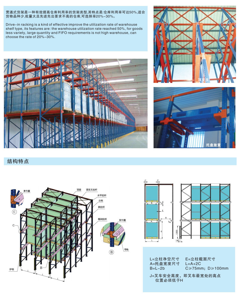 3.這種貨架適用存儲大(dà)批(pī)量、少品種的物品,貫通式貨架(駛入式貨(huò)架(jià))的牛腿及(jí)牛腿擱板(bǎn)均采用整(zhěng)體衝壓/滾壓技術,具有承(chéng)載能力強,外(wài)型美觀貨物。